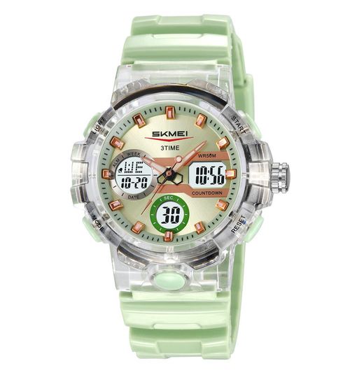 Electronic watch, multi-functional, dual display, sports-grade, waterproof, timekeeping.