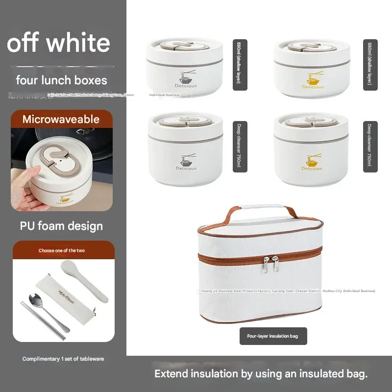 A set of four 304 stainless steel insulated lunch boxes with insulated bags, leak-proof and airtight, and microwave-safe.